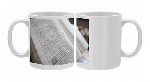 Photo Mug showing Latin Bible, France, Europe. Latin Bible, France, Europe. Chosen by Robert Harding. 11oz White ceramic coffee mug. Image printed using sublimation ink process. Microwave, dishwasher safe. This item is shipped from our American lab.